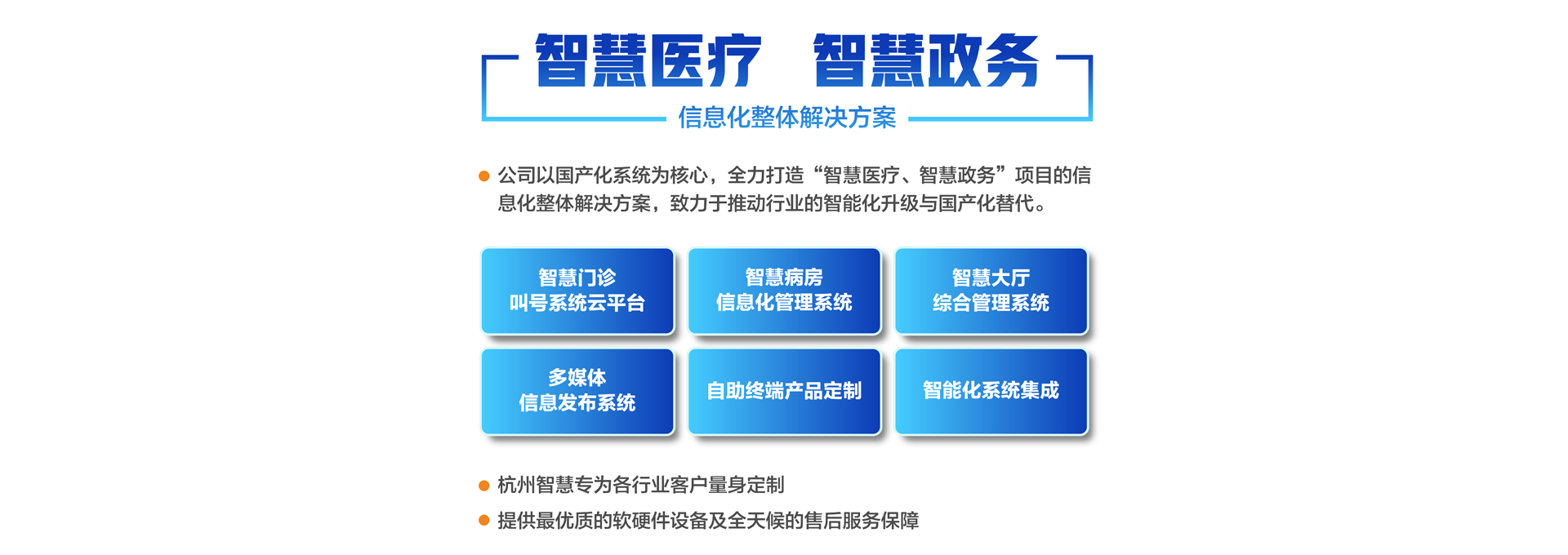 杭州智慧科技有限公司初創(chuàng)于2003年,總部位于重要的電子商務中心中國杭州公司主營業(yè)務有:智慧分診叫號系統(tǒng)、智慧病房醫(yī)護對講系統(tǒng)、智慧大廳綜合管理系統(tǒng)、智慧政務管理系統(tǒng)、智慧多媒體信息發(fā)布系統(tǒng)、導診系統(tǒng)及各自助終端產(chǎn)品定制。專為各行業(yè)客戶量身定制。公司已有20余年行業(yè)經(jīng)驗沉淀積累,擁有優(yōu)秀的產(chǎn)品外觀設計師和各類中高級專業(yè)技術(shù)工程師,確保所研發(fā)的產(chǎn)品具有行業(yè)領(lǐng)先的外觀及可靠的技術(shù)性能。并擁有權(quán)威部門頒發(fā)的各類知識產(chǎn)權(quán)及專利證書,30多項資質(zhì)證書、800多個合作伙伴、2000多個項目成功案例經(jīng)驗。 智慧產(chǎn)品已遍及全國各醫(yī)療、政務、金融、通訊、公安、工商、稅務等行業(yè),形成以“立足杭州、輻射長三角、拓展全國”的戰(zhàn)略發(fā)展格局,產(chǎn)品經(jīng)過歷年不斷創(chuàng)新,形成專業(yè)化、平臺化,致力于成為智慧產(chǎn)品的領(lǐng)軍企業(yè)。 公司建立了完善的技術(shù)培訓及售后服務中心,并設24小時熱線咨詢電話解答用戶反饋的問題。同時應客戶要求定期派技術(shù)人員到 全國各地進行技術(shù)指導輔助用戶正確使用智慧產(chǎn)品并能獨立安裝、調(diào)試、日常維護等工作。提供最優(yōu)質(zhì)的設備及全天候的售后服務保障,智慧永恒不變的服務宗旨——致力于客戶的滿意與成功!...